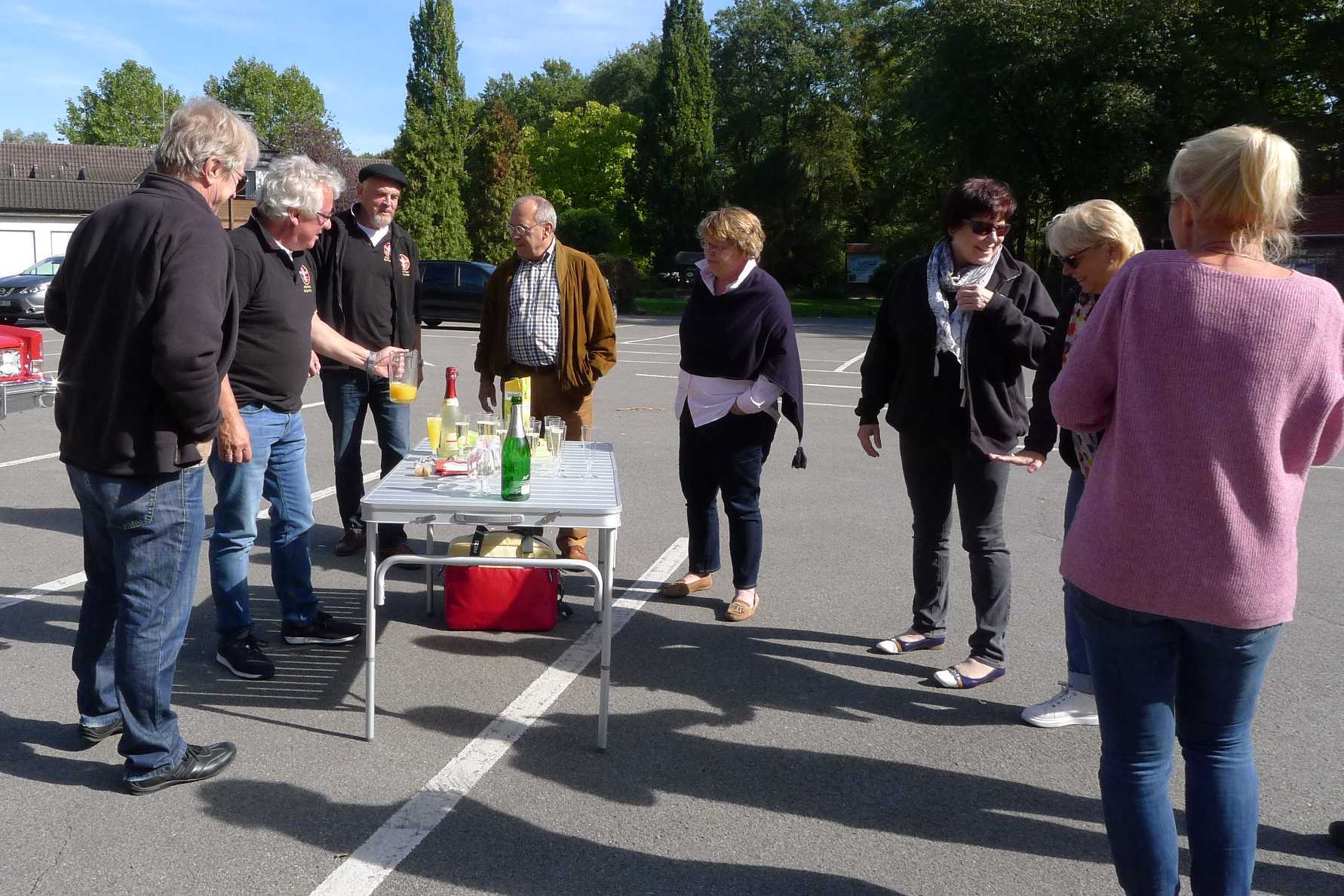 Treffpunkt war das Café „Ginger coffee and more“ in Kaarst wo wir gut bewirtet wurden. Der Parkplatz der Raiffeisenbank neben dem Café war für uns extra reserviert. Es dauerte einige Zeit bis alle ihr Rallyeschild montiert hatten und mit leichter Verzögerung startete die Rallye dann mit einer ersten Geschicklichkeitsaufgabe. Hier war die Teamarbeit von Fahrer und Beifahrer gefragt. Vier Bierdeckel wurden ausgelegt und der Wagen sollte mit seinen Rädern auf möglichst alle Bierdeckel gestellt werden (ohne Hilfe von Einweisern). Wer das für ganz einfach hält, kann es gerne einmal selbst probieren. Etliche Oldtimer schafften es nicht auf einen einzigen Deckel. Danach ging es mit dem Roadbook auf die Strecke zur Rheinfähre nach Zons. Die Strecke war gut gewählt und keiner ging verloren. Nach der Fähre wartete schon die nächste Aufgabe, der Umfang eines mächtigen Baumes war zu schätzen. Wer seine Schulkenntnisse noch im Kopf hatte "Umfang = Durchmesser mal Pi" war klar im Vorteil. Danach führte uns das Roadbook ins Bergische Land mit dem Mittagsziel "Schloss Burg" in Solingen. Auch hier hatten wir einen eigens reservierten Parkplatz und hier warteten auch die nächsten Aufgaben auf die Teams. Wer weiß denn wie heiß der Auspuffkrümmer seines Autos ist, da lag so mancher weit daneben und beim Käfer war es gar nicht so einfach, überhaupt den Motorkrümmer zu erreichen. Die Burg war an dem Tag sehr gut besucht und wir brauchten etwas länger bis alle zu Mittag gegessen hatten. Zurück nach Kaarst ging es dann in Kolonne was bei 18 Fahrzeugen schon etwas schwieriger ist. Jörg hat uns dazu in das "Second drop" Verfahren eingewiesen, das die ersten paar Kilometer auch gut funktionierte. Dann aber riss die Kette irgendwie ab und der hintere Teil der Kolonne blieb verschwunden. Eigenartig war nur, dass am Schlusspunkt der Tour gerade dieser hintere Teil der Kolonne als erstes angekommen war. Da war die Verblüffung groß, das müssen wir wohl noch einmal üben ;-). Leckeren Kuchen gab es dann im „Kunstcafé Einblick“ in Kaarst. Hier wurde es noch einmal spannend, denn jetzt wurde fleißig gerechnet wie denn die Plätze verteilt sind. Gewonnen hatte das Team Donath und den dritten Platz hat das Team Hanisch erobert. Jetzt sind wir natürlich gespannt, was sich Barbara und Gerhard für nächstes Jahr ausdenken.