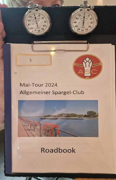 Danach konnte es dann losgehen. Ganz klassisch wurden zunächst die Ralleyschilder mit den Startnummern montiert und das Roadbook verteilt. Der Start selbst bildete die erste Aufgabe, eine kurze Strecke musste noch auf dem Parkplatz in einer vorgegebenen Zeit passiert werden. Danach ging es auf die Tour. Unterwegs waren einige Aufgaben eingebaut, bei denen man Daten zu bestimmten Landmarken notieren sollte. Erstes Highlight der Tour war der Besuch des Rosengart Museums in Bedburg. Auch wenn man das Museum schon kennt, ist es doch immer wieder faszinierend was die privaten Sammler dort zusammen getragen haben. Mittagspause war dann in einem Restaurant in Bergheim. Bevor wir dann gut gestärkt wieder auf die Strecke gingen, stand die nächste Aufgabe an. Aus einem Sortiment an Schrauben und Muttern waren die passenden Paare zusammen zu schrauben. Dabei gab es metrische, zöllige und Varianten mit Linksgewinde. Wer in der vorgebenen Zeit acht Paare schaffte war schon gut. Leider war ein Team beim Aufbruch so schnell, dass die Übung noch gar nicht aufgebaut war, als sie den Parkplatz verließen. Die Rückschleife in die Heimat verlief sehr entspannt über längere Streckenabschnitte. Mit den Orten Dülken, Süchteln, Tönisvorst kamen wir dann wieder zu Hause an und das Ende der Tour war dann das Hofcafe "Sankt Töniser Obsthof". Hier erfolgte dann die Auswertung der Tourenaufgaben und die Bekanntgabe der Plätze. Es war schon spannend zu sehen, wo man gelandet war. Die drei ersten Plätze wurden mit einem Pokal geehrt, wobei der dritte Platz dann auch das traditionelle Gurkenglas erhielt --- als Zeichen für die besondere Aufgabe, die nächste Maitour zu organisieren. Also Martina und Jörg, die Latte liegt recht hoch ,-).
